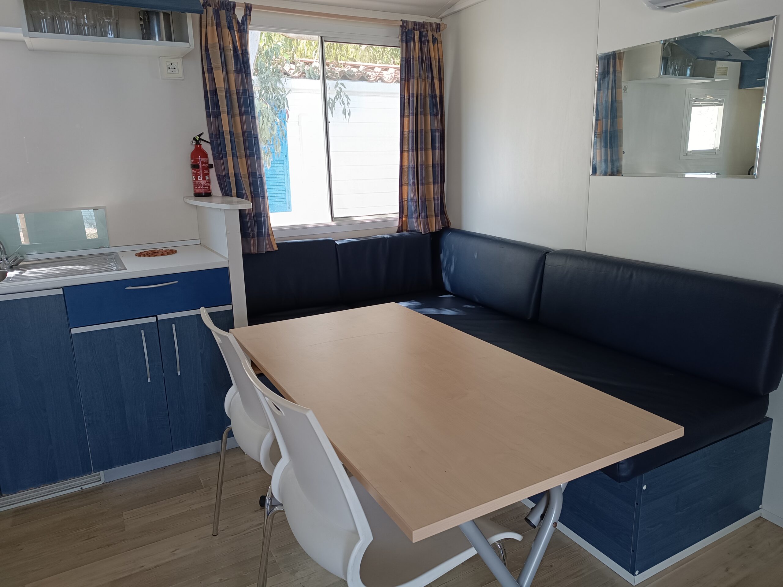 Υπάρχει επίσης τραπεζαρία σε συνδυασμό με κουζίνα, η οποία περιλαμβάνει ψυγείο, φούρνο μικροκυμάτων, εστία μαγειρέματος με γκάζι και βασικό εξοπλισμό για μαγείρεμα και φαγητό.